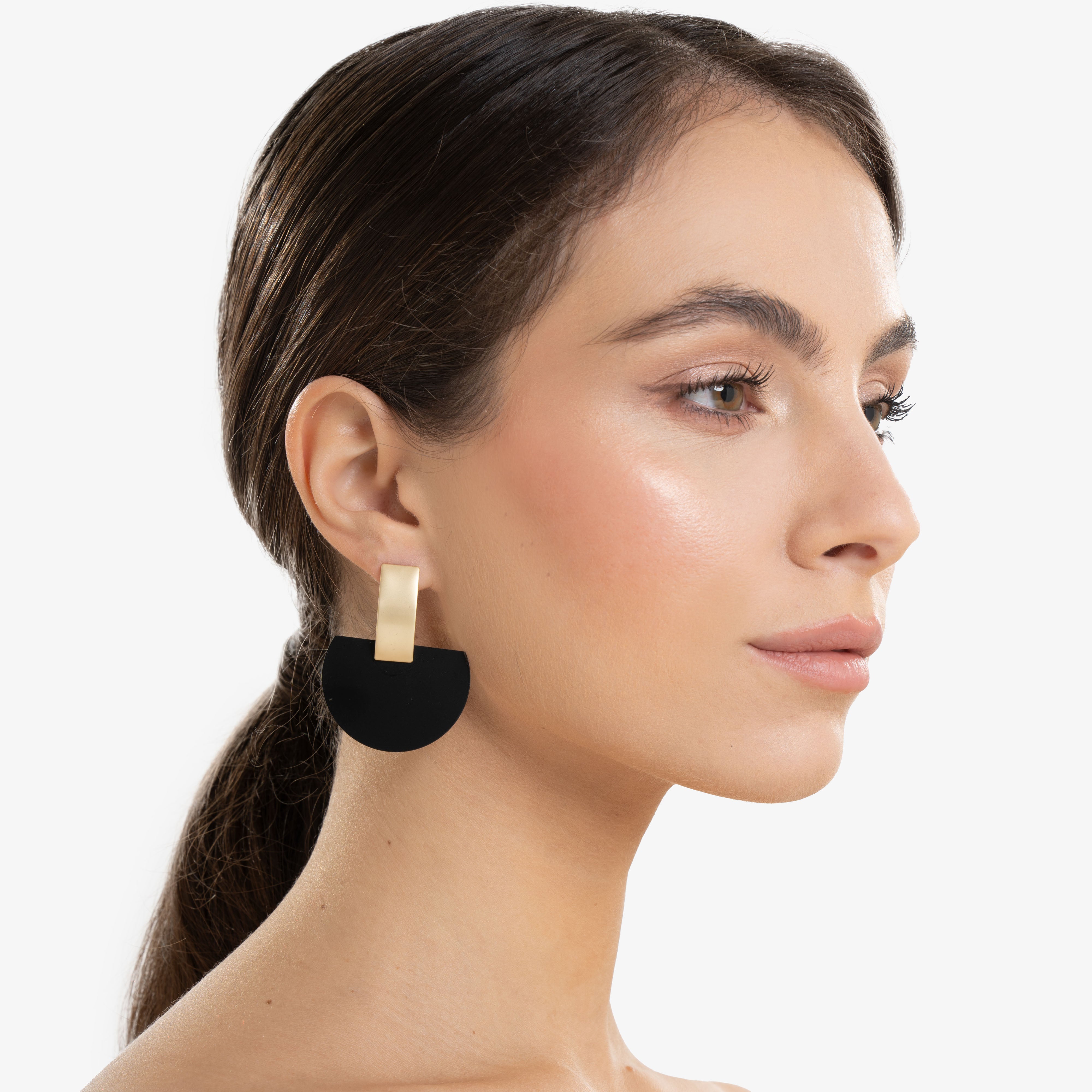 Inspired by the delicacy of the moon phases, the earrings Mezza Luna represent the perfect balance between light and shadow. Their semi-circular shape, with the golden part rising above the matte black, recalls the crescent moon that illuminates the night sky with its discreet and magnetic glow.