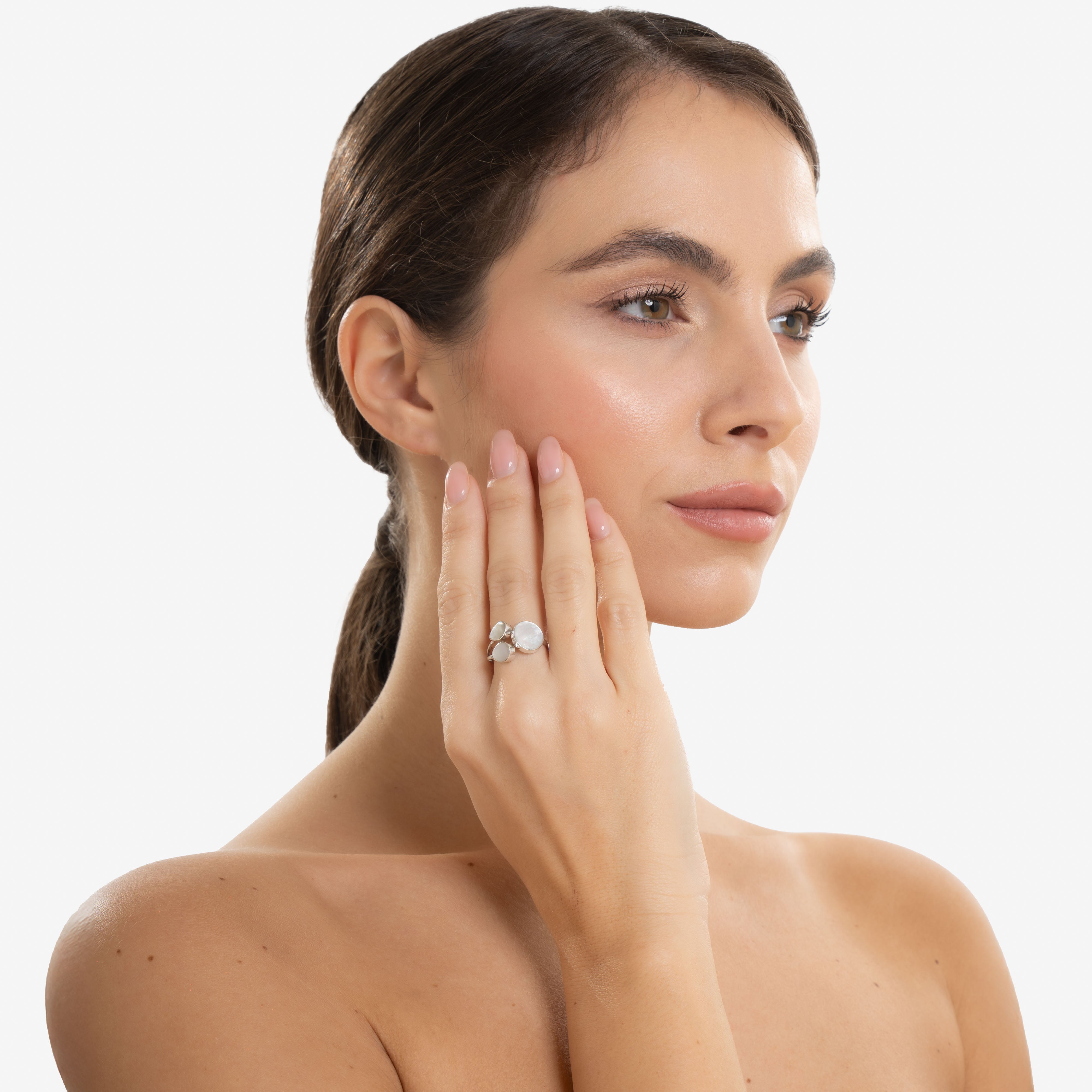 Design asimmetrico ma bilanciato, questo anello si distingue per la composizione di tre elementi in madreperla naturale: un disco centrale e due gocce laterali, montati su una base in argento 925 con struttura regolabile e aperta.