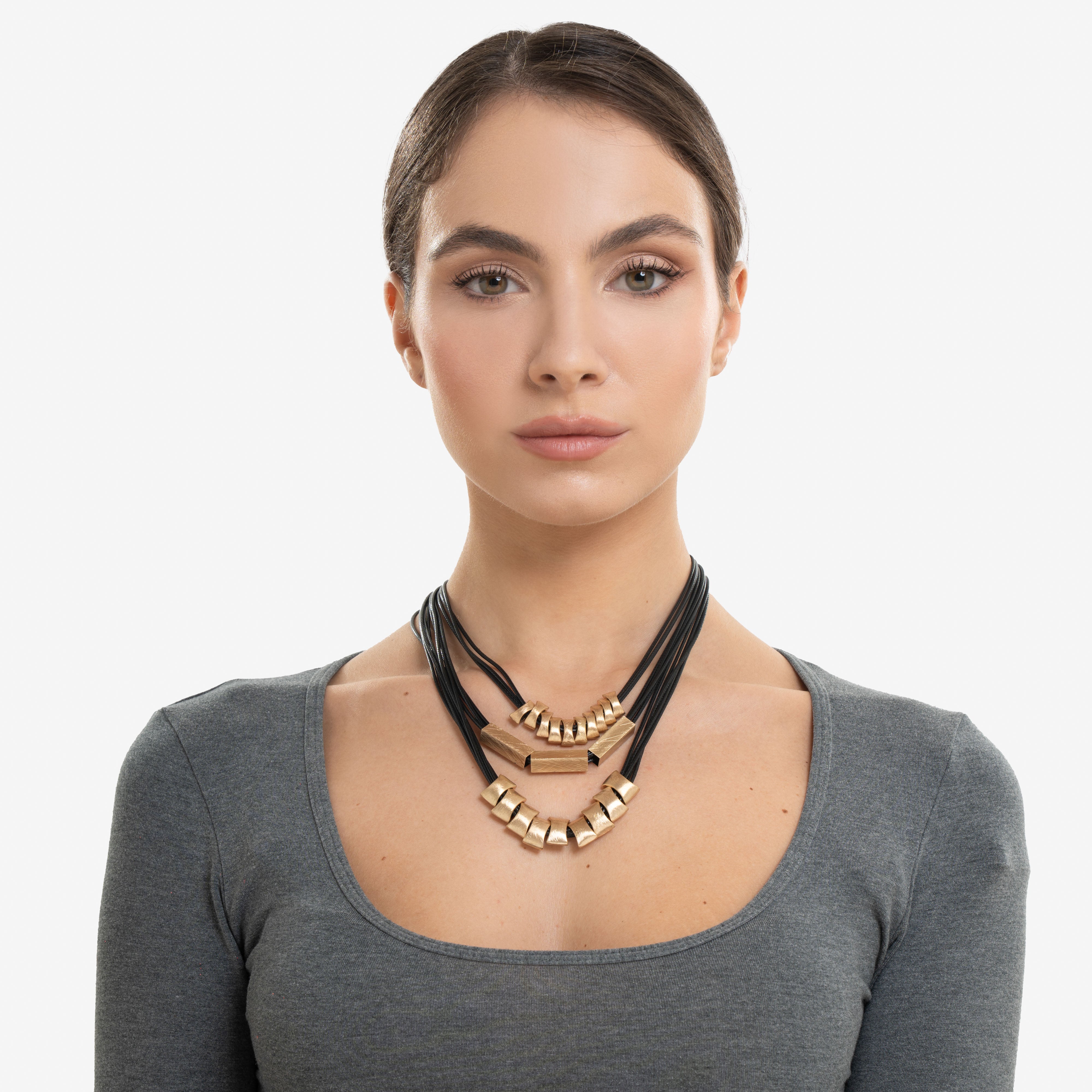 Realizzati in lega di zinco anallergica, i tre moduli presentano una finitura dorata opaca, calda e vellutata, che restituisce una presenza luminosa ma sobria. L’inclinazione decisa rompe la verticalità classica, offrendo un effetto visivo inaspettato. Il tutto è sospeso su un laccio nero minimale, che accompagna senza disturbare l’equilibrio delle forme.