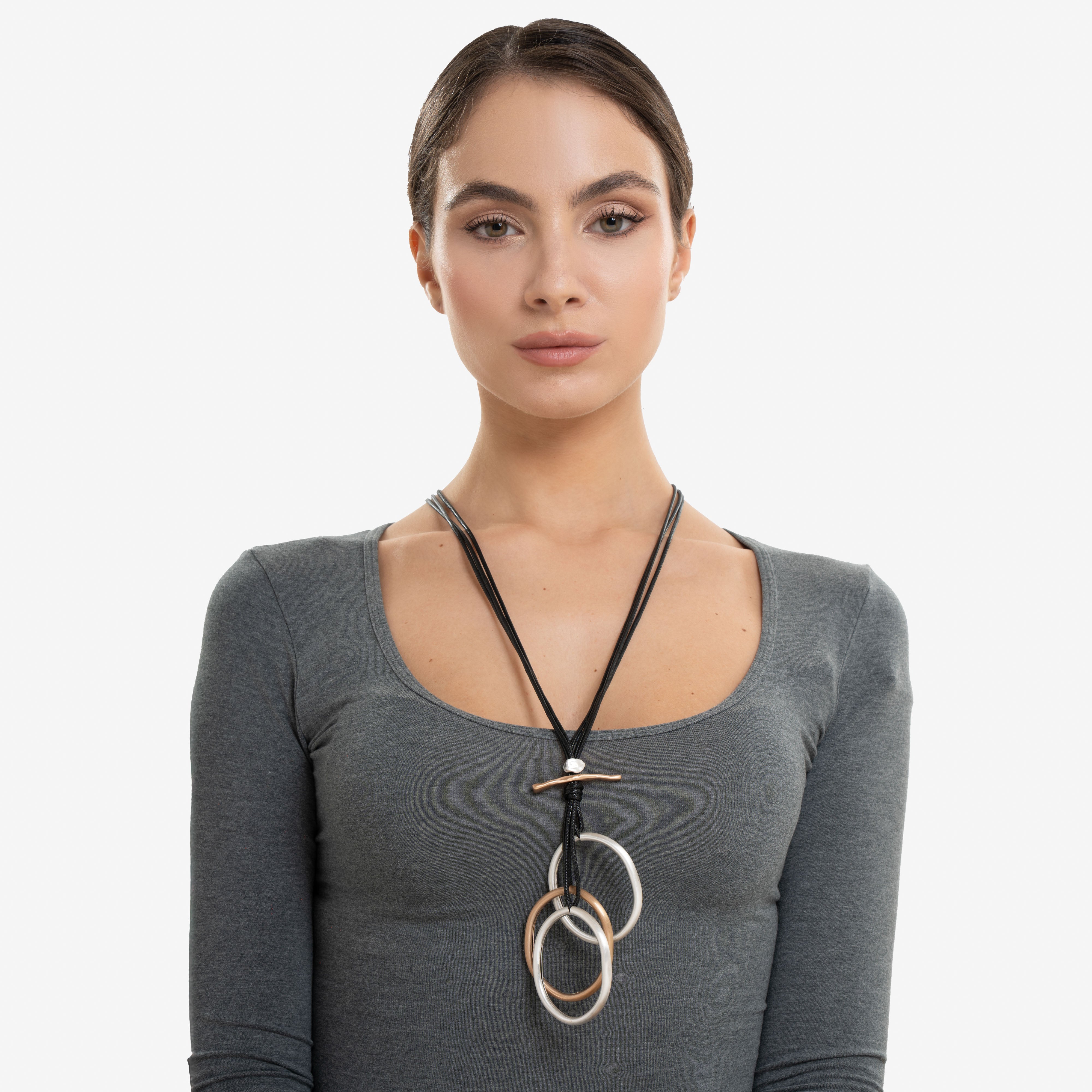 I tre cerchi, in finitura oro satinato, argento liscio e grigio opaco, sono realizzati in lega di zinco anallergica, e si bilanciano perfettamente lungo un due lunghi lacci neri.