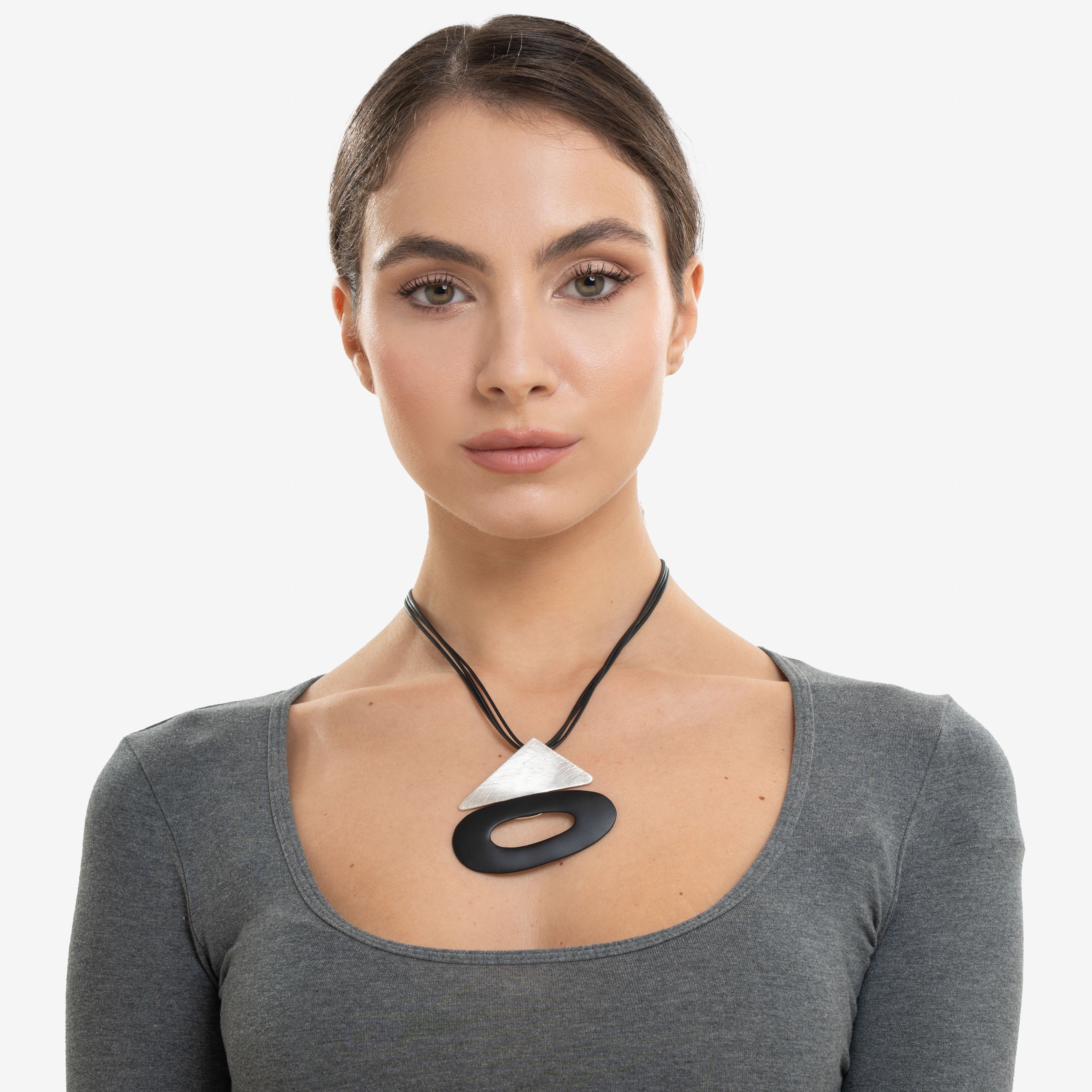 Un triangolo argentato e un ovale nero opaco si incrociano in una composizione irregolare. Prisma è una collana che esplora la tensione tra forme, creando un movimento visivo.