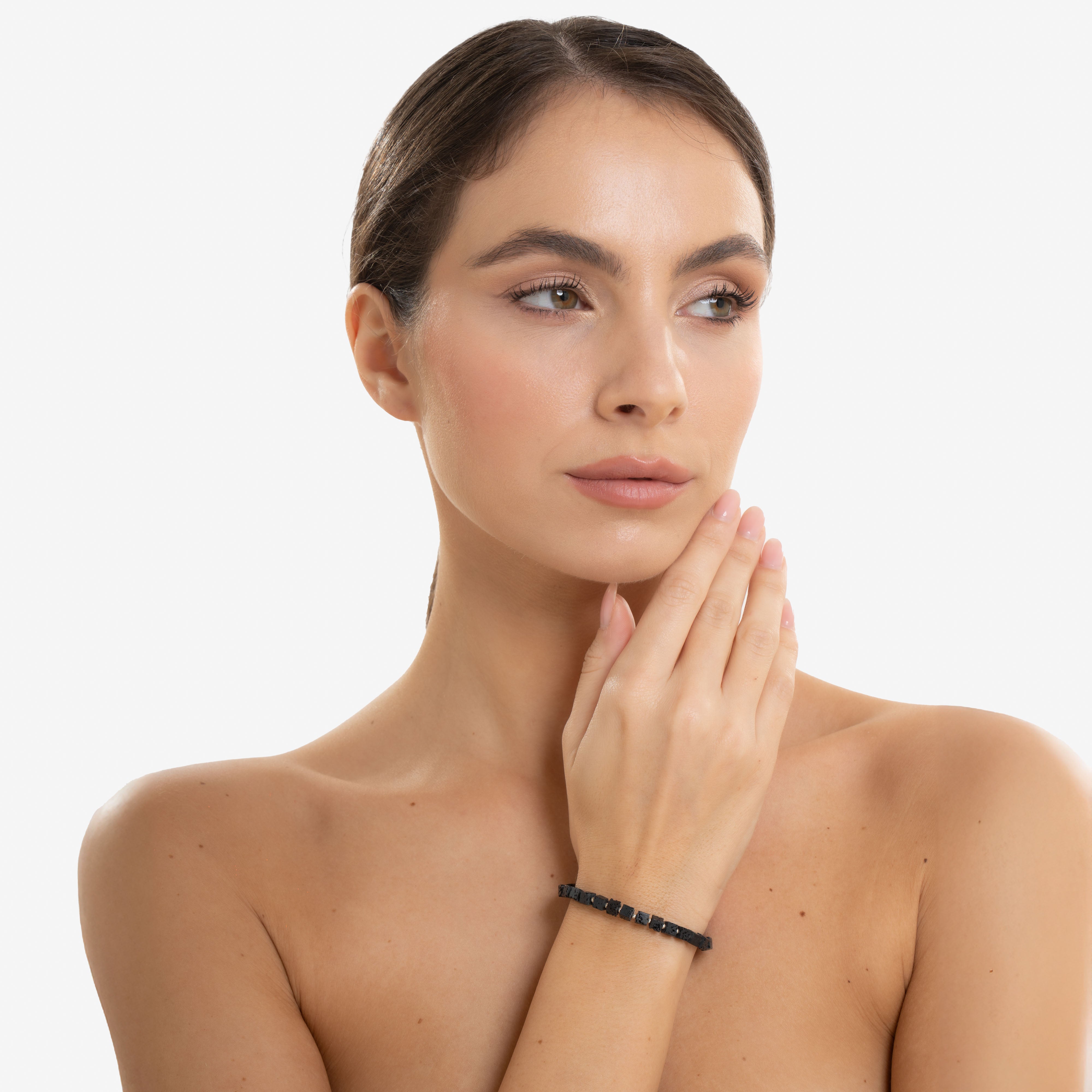 Bracciale composto da cubetti di pietra lavica naturale, disposti in sequenza regolare. Le superfici irregolari e la porosità tipica della lava creano un gioco materico. La struttura si completa con una chiusura in argento 925, dettaglio che aggiunge luminosità e pregio al design essenziale.
