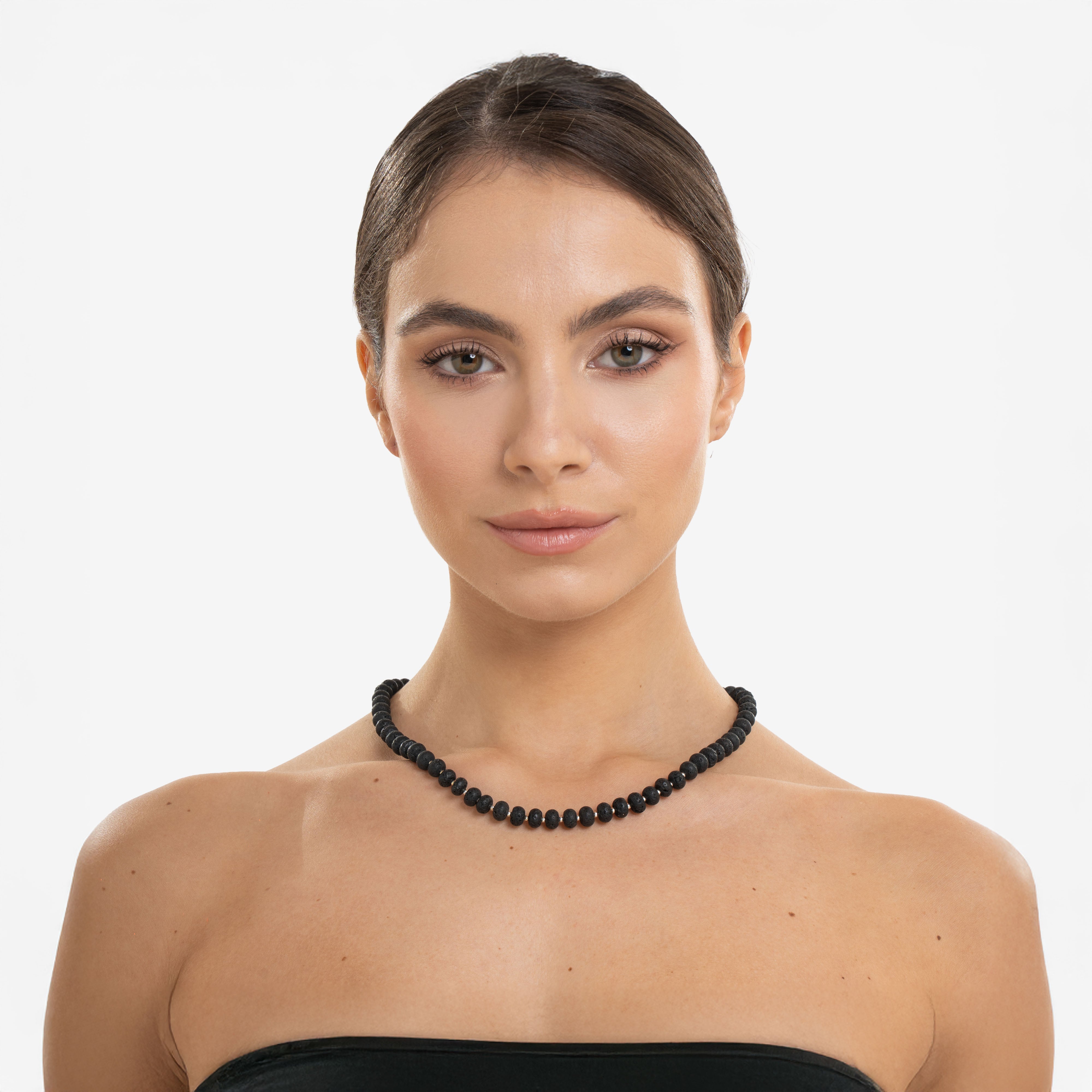 Una sequenza di rondelle in pietra lavica, perfettamente levigate, disegna una curva regolare e continua. Il ritmo uniforme e compatto della materia vulcanica, alternata a piccole sfere di acciaio, crea una presenza netta, discreta, potente. Il gancio in argento 925 chiude con precisione, lasciando spazio solo all’essenza della forma.
