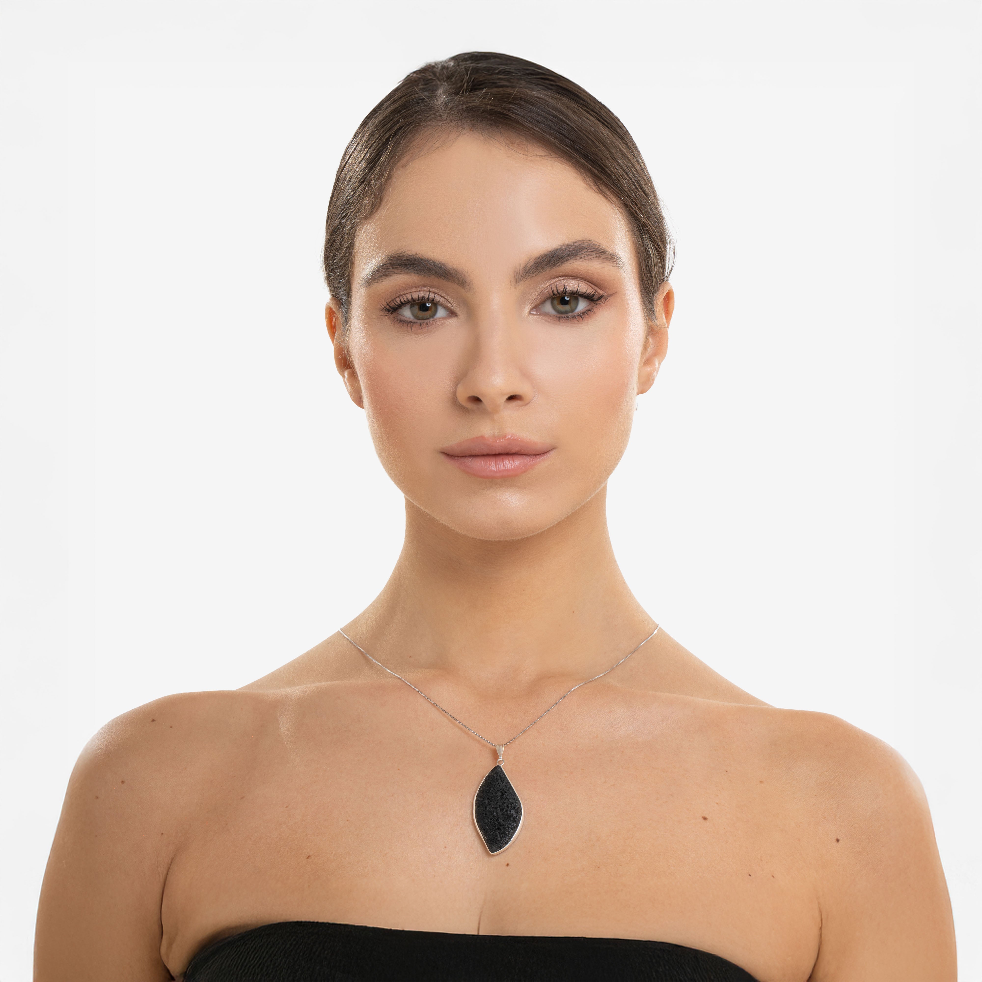 Una foglia stilizzata, in pietra lavica scura, emerge con eleganza da una cornice sottile in argento 925 che ne segue il profilo asimmetrico. La forma è allungata e appuntita, con curvature leggere che ricordano una foglia d’acqua adagiata sulla superficie, immobile e viva. Il contrasto tra la materia porosa e il bordo lucente crea un gioco visivo sottile, delicato e profondo.