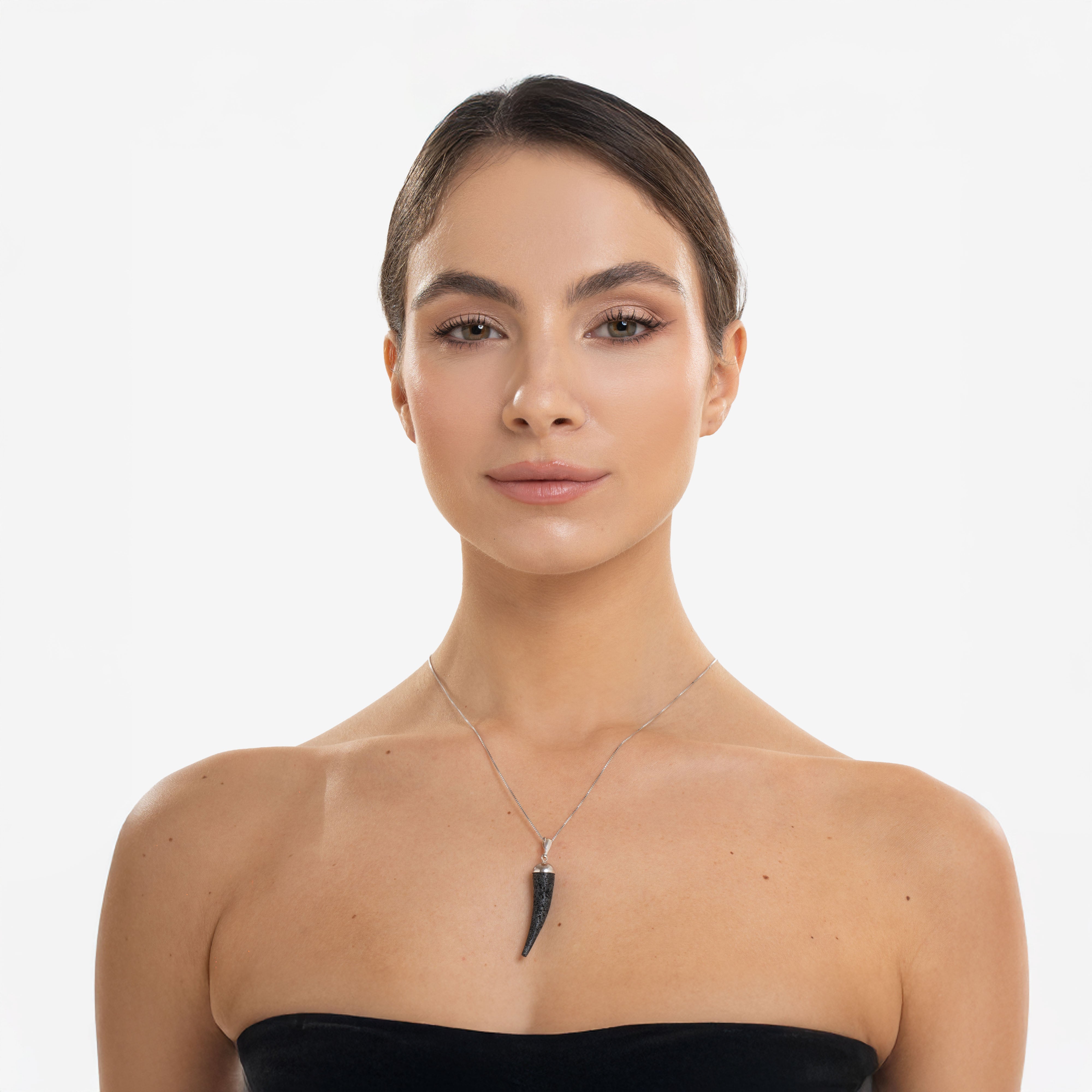 Un pendente affusolato, scolpito in pietra lavica nera, che si restringe con eleganza verso l’estremità, evocando il profilo del classico corno. Il gancio in argento 925 ne completa il disegno con una linea essenziale e luminosa.
