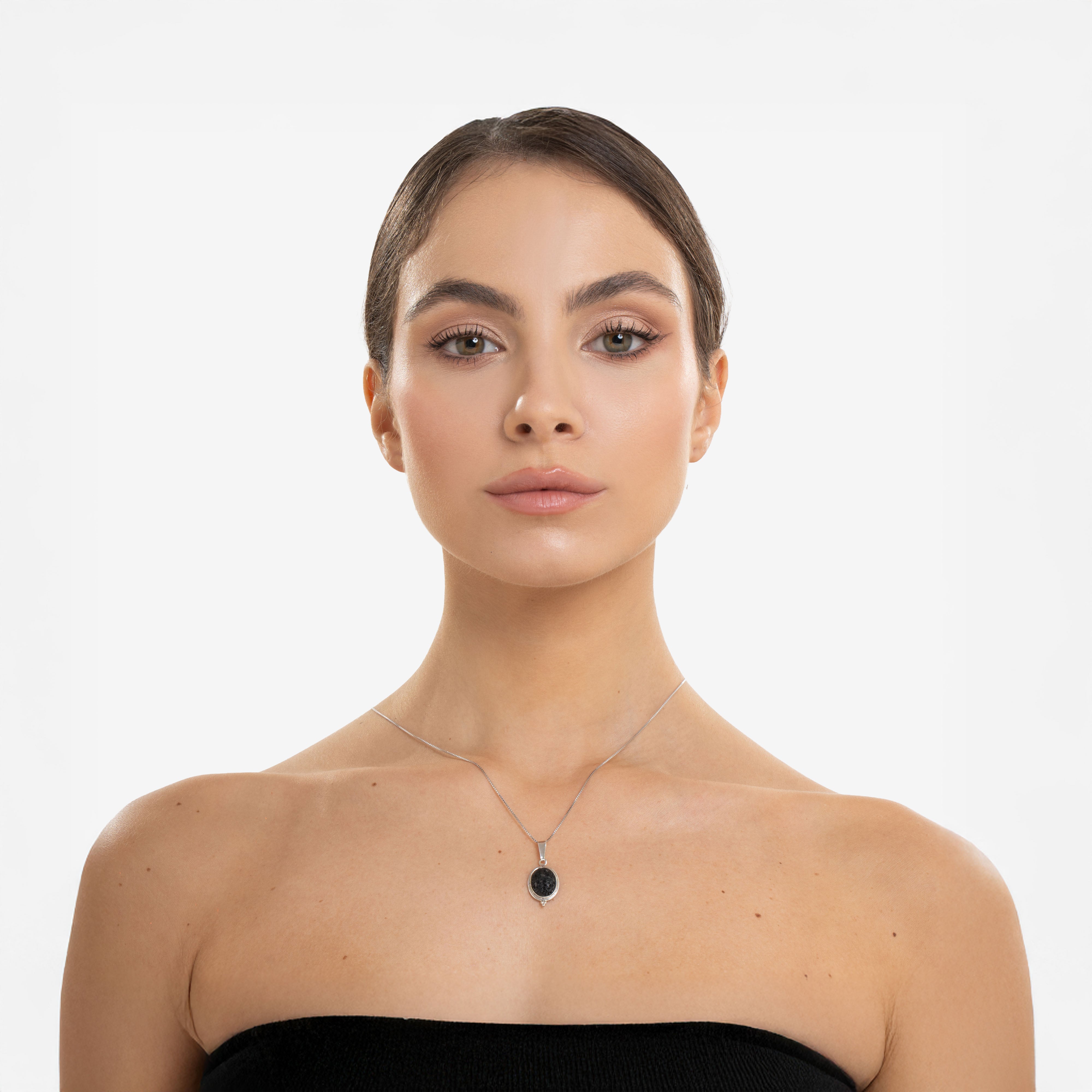 Forma perfetta e proporzioni bilanciate definiscono questo pendente in pietra lavica, incorniciato da una sottile fascia in argento 925 che ne disegna il contorno con essenzialità. La sua geometria circolare richiama un equilibrio stabile e silenzioso, come un punto fermo nello spazio. Il bordo in argento lucido accompagna con discrezione la matericità scura della pietra, creando un contrasto visivo e tattile dal carattere sobrio e contemporaneo.