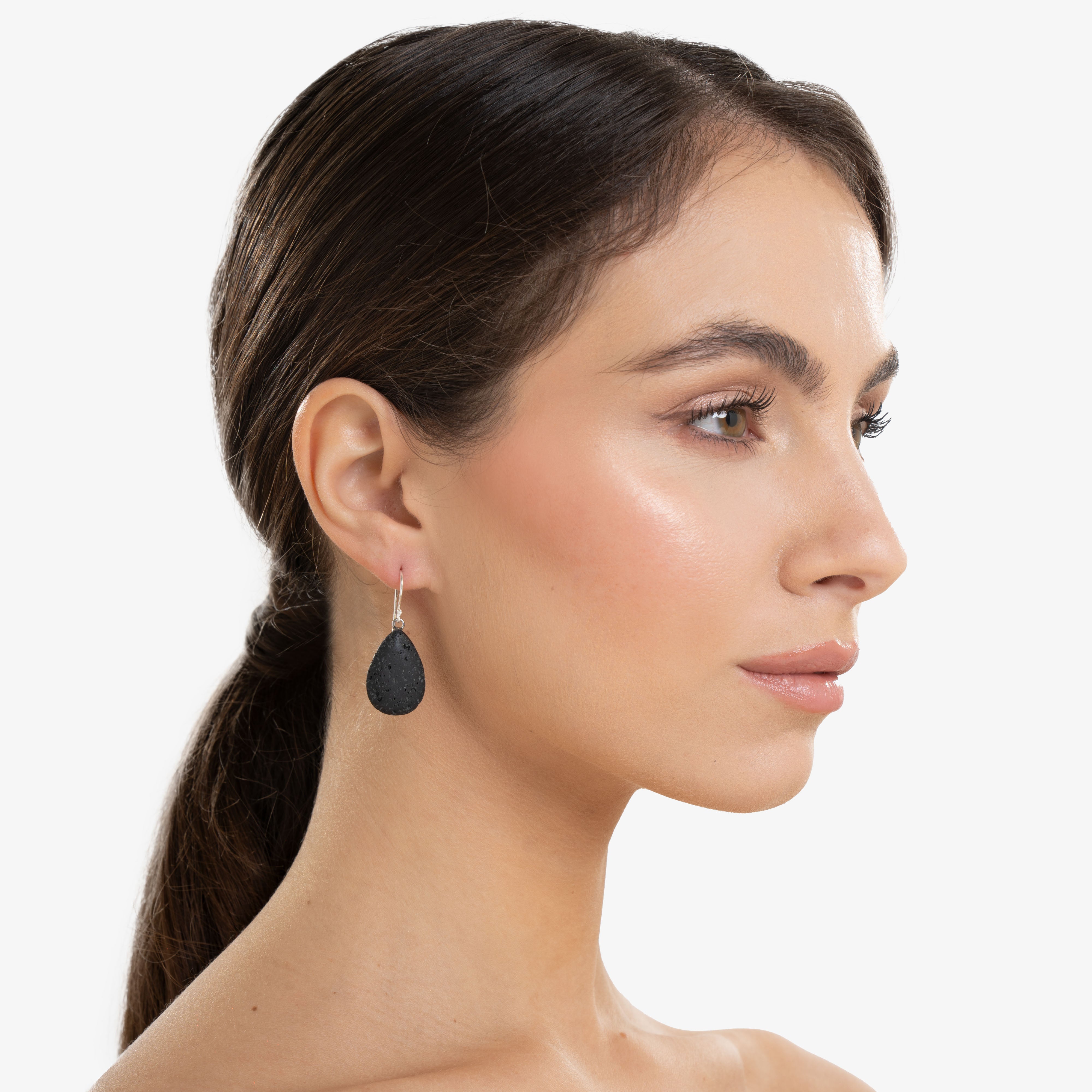 La goccia in pietra lavica naturale, dal profilo morbido e materico, cattura lo sguardo con la sua intensità profonda. Un sottile gancio in argento 925 sostiene la composizione, esaltandone il contrasto tra luce e materia viva.