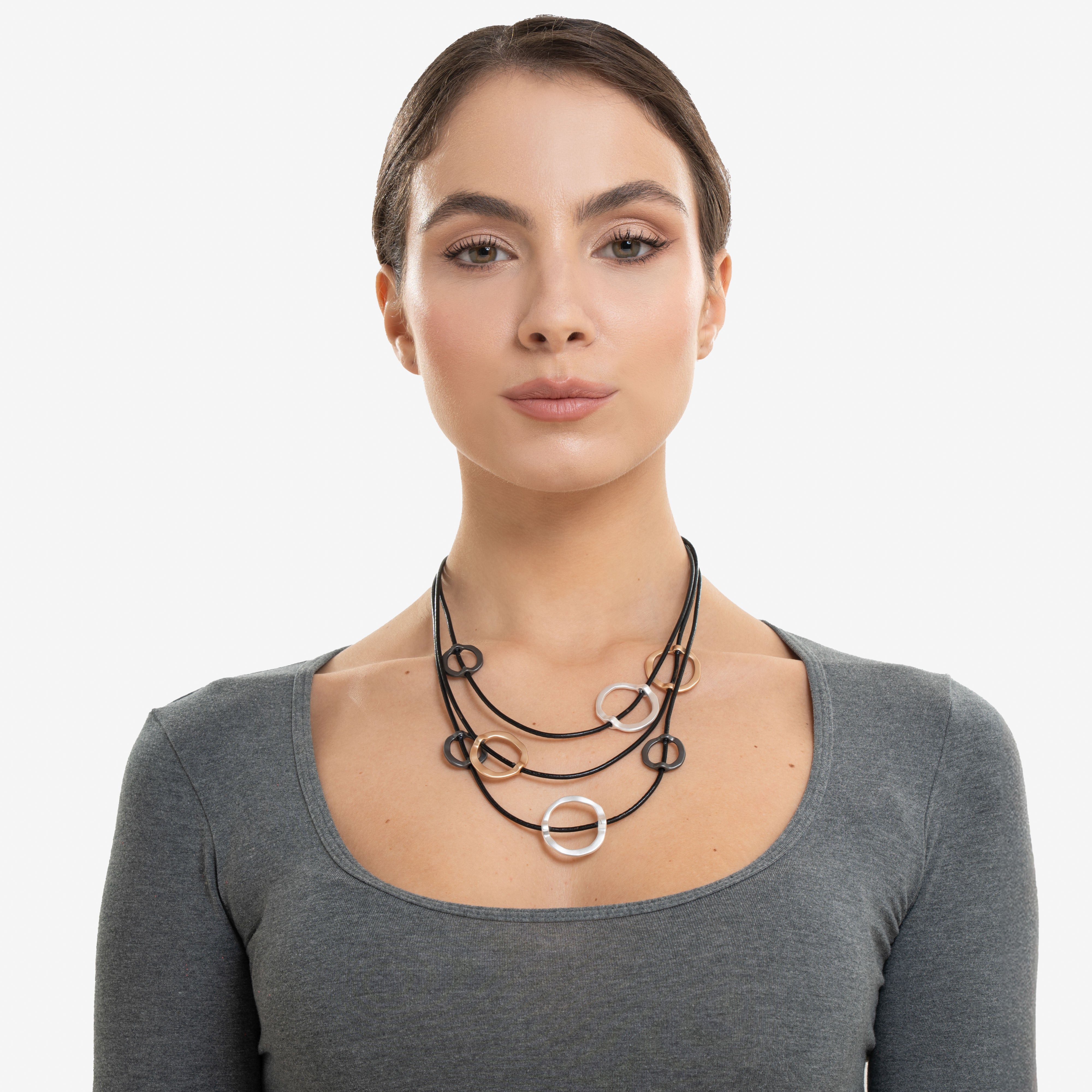 Una sequenza di cerchi satinati, martellati e opachi si dispone in un ritmo orizzontale leggero ma strutturato. Motus è una collana modulare, costruita sul movimento, sul fluire delle forme uguali ma diverse.
