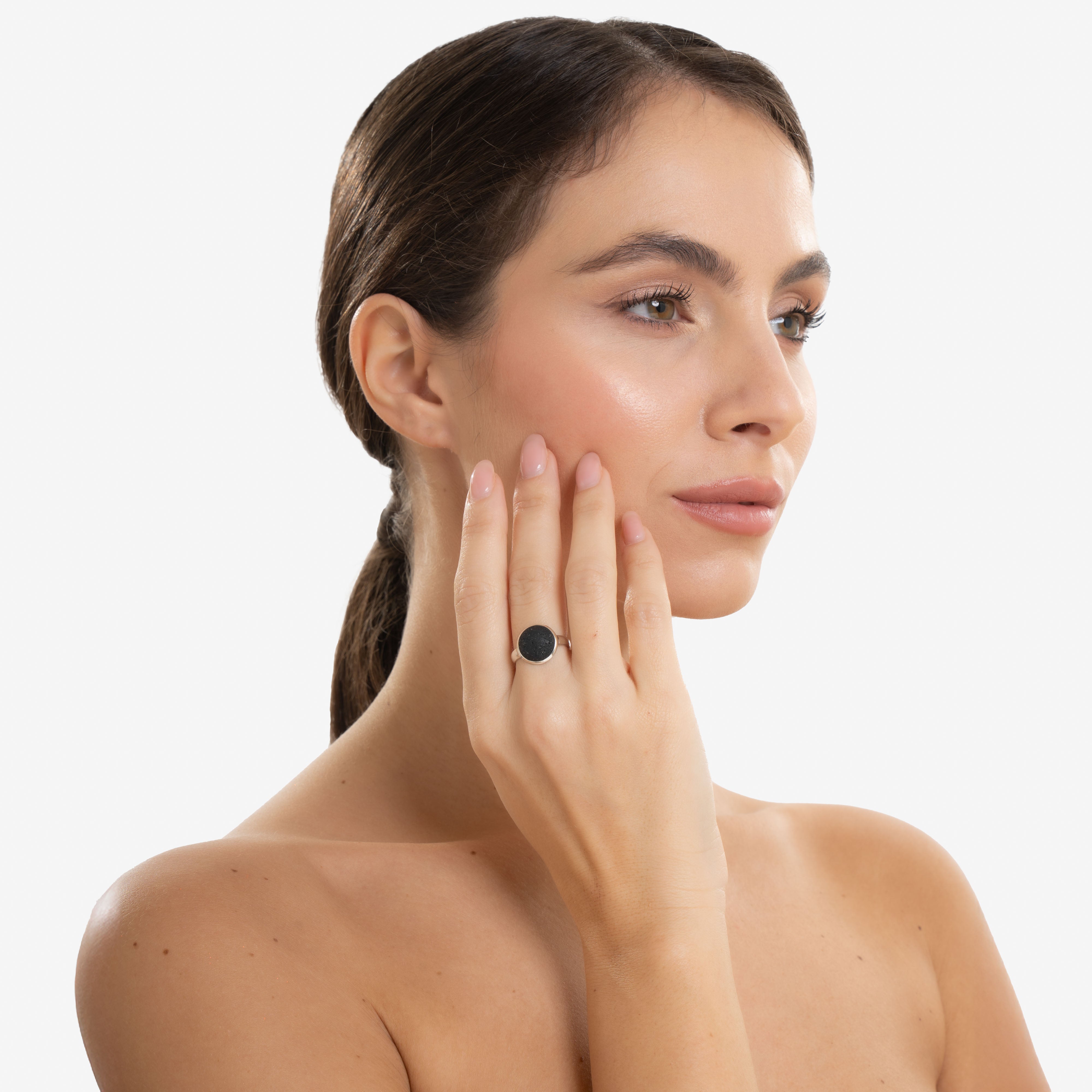 Un disco di pietra lavica si posa al centro della mano come un sigillo. scuro, poroso, essenziale, incastonato in una sottile montatura in argento 925. La forma pura e priva di decorazioni riflette l’intenzione di custodire un’energia silenziosa, intensa e continua. La struttura dell’anello è fissa e compatta, pensata per valorizzare l’equilibrio tra solidità e semplicità.