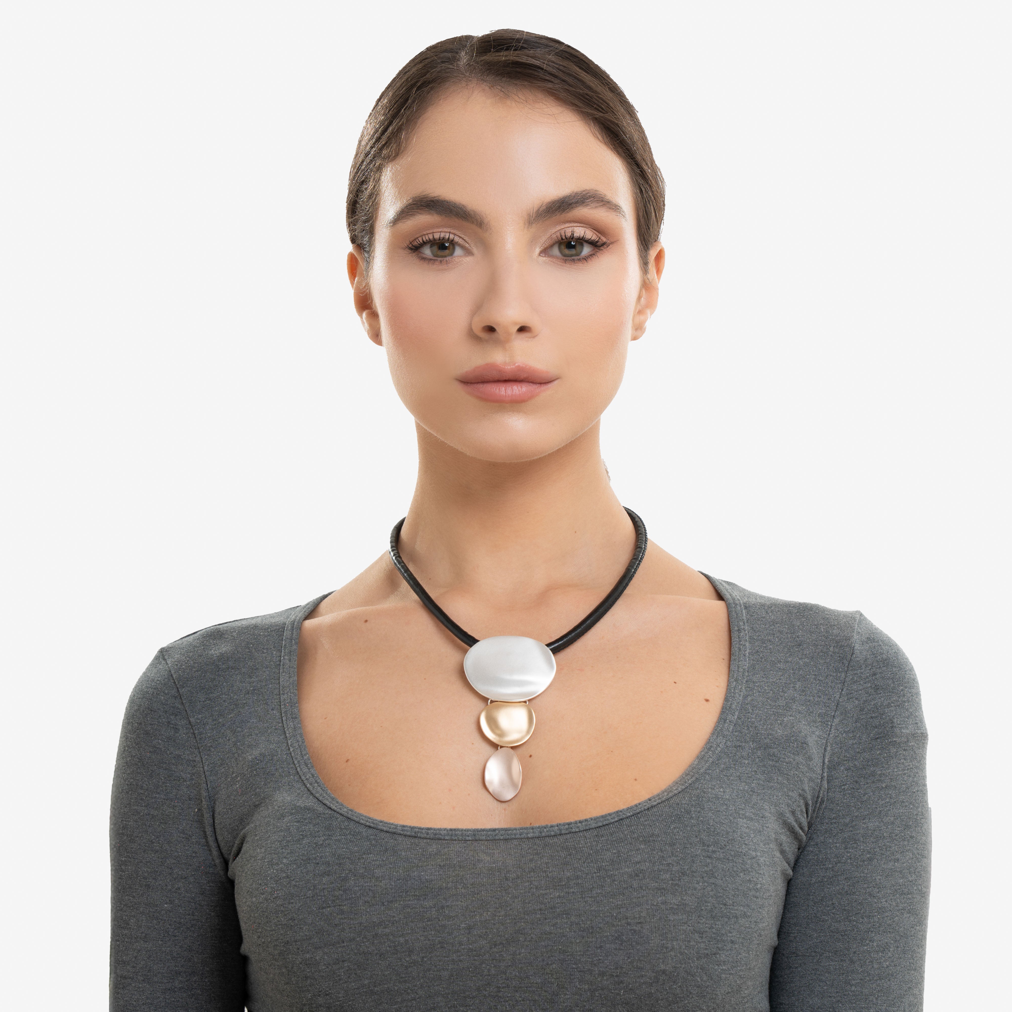 L’elemento centrale è leggermente snodato, permettendo un movimento fluido sul décolleté. Il tutto è sostenuto da un laccio nero semplice che lascia spazio alla composizione.