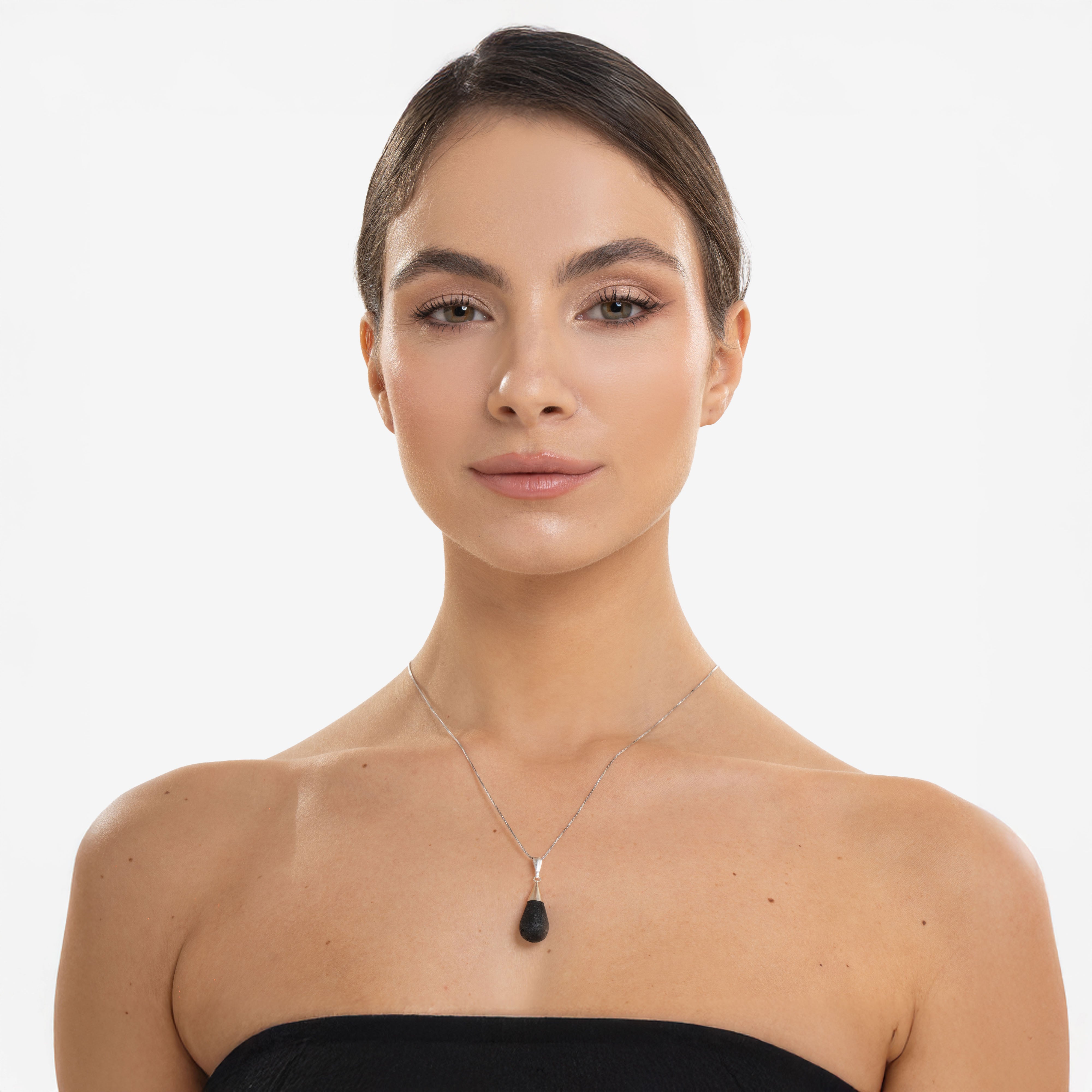 Una goccia di pietra lavica, dalla forma fluida e armoniosa, sembra sospesa tra cielo e terra. La sua superficie irregolare, lasciata volutamente grezza, dialoga con il contrasto elegante dell’argento 925 lucido, che ne abbraccia la sommità con una linea netta ed essenziale.
