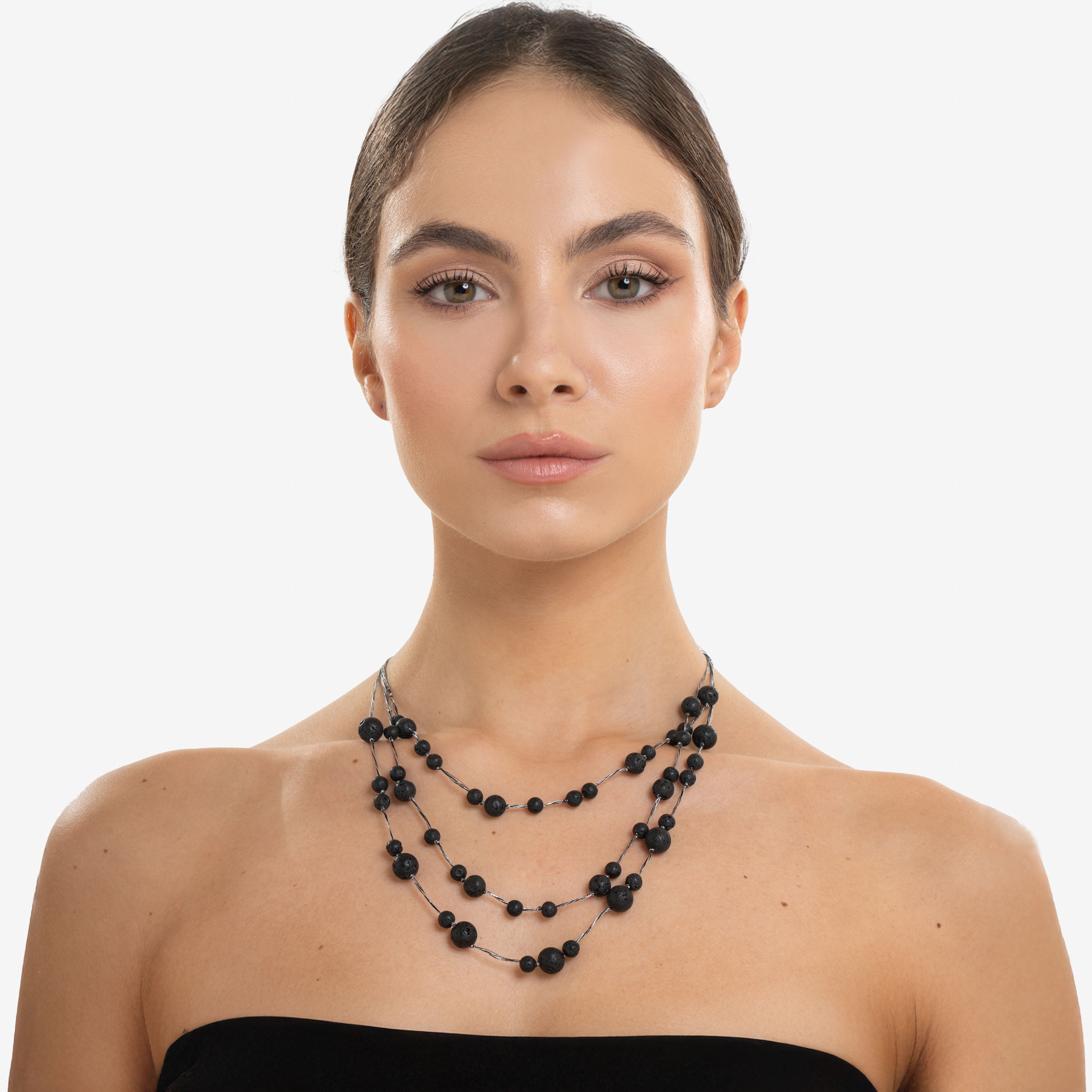 Veteri è una collana stratificata e leggera, che gioca con i volumi e con lo spazio, lasciando respiro tra le forme senza perdere intensità. Ogni sfera nera trattiene la forza della roccia, mentre i fili si muovono come linee di un disegno libero.