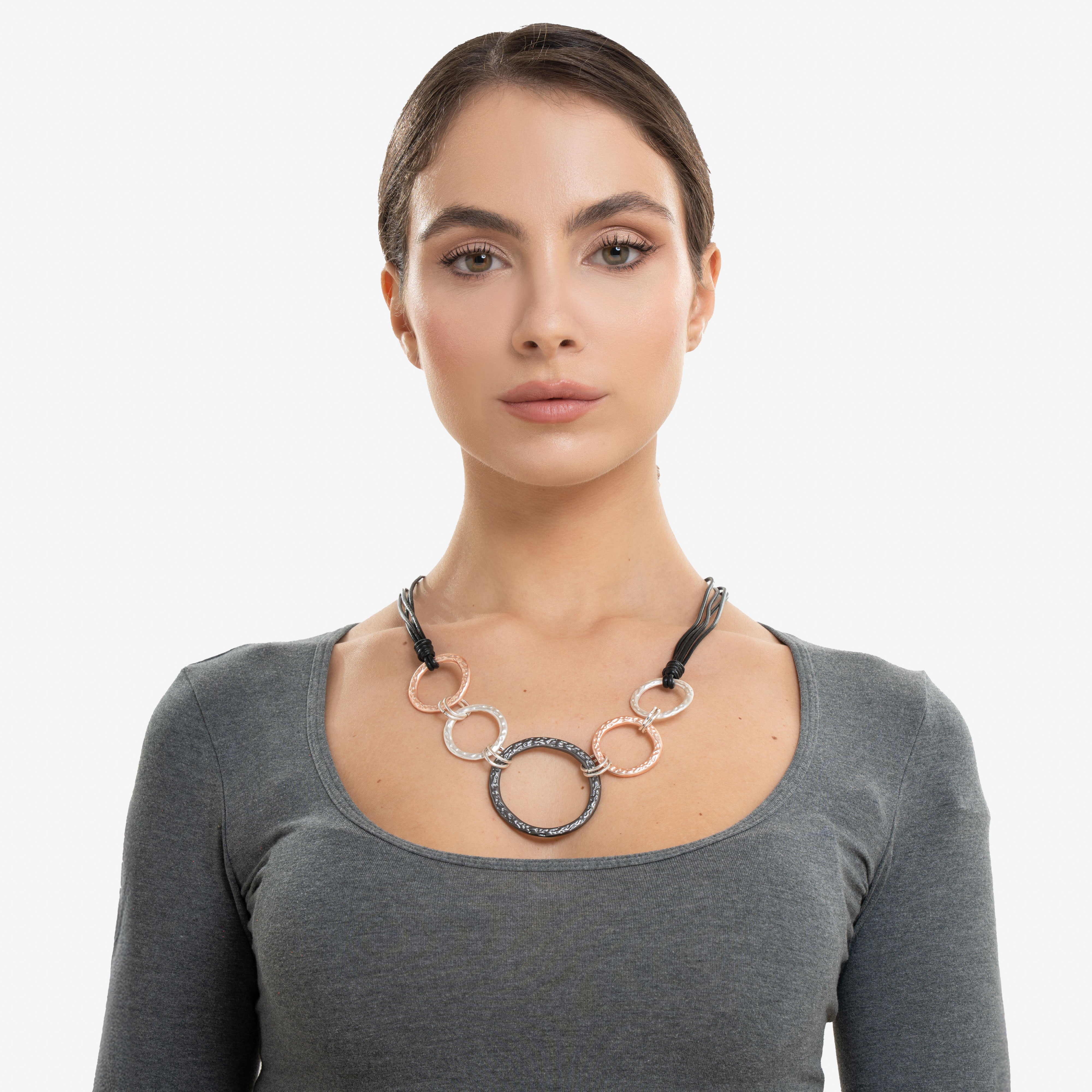 Cinque cerchi pieni in finitura martellata — rosato, grigio, argentato — si susseguono come anelli di un sistema armonico. Nexus è una collana in lega di zinco anallergica compatta ma ritmica, in cui ogni elemento è collegato al successivo con precisione.