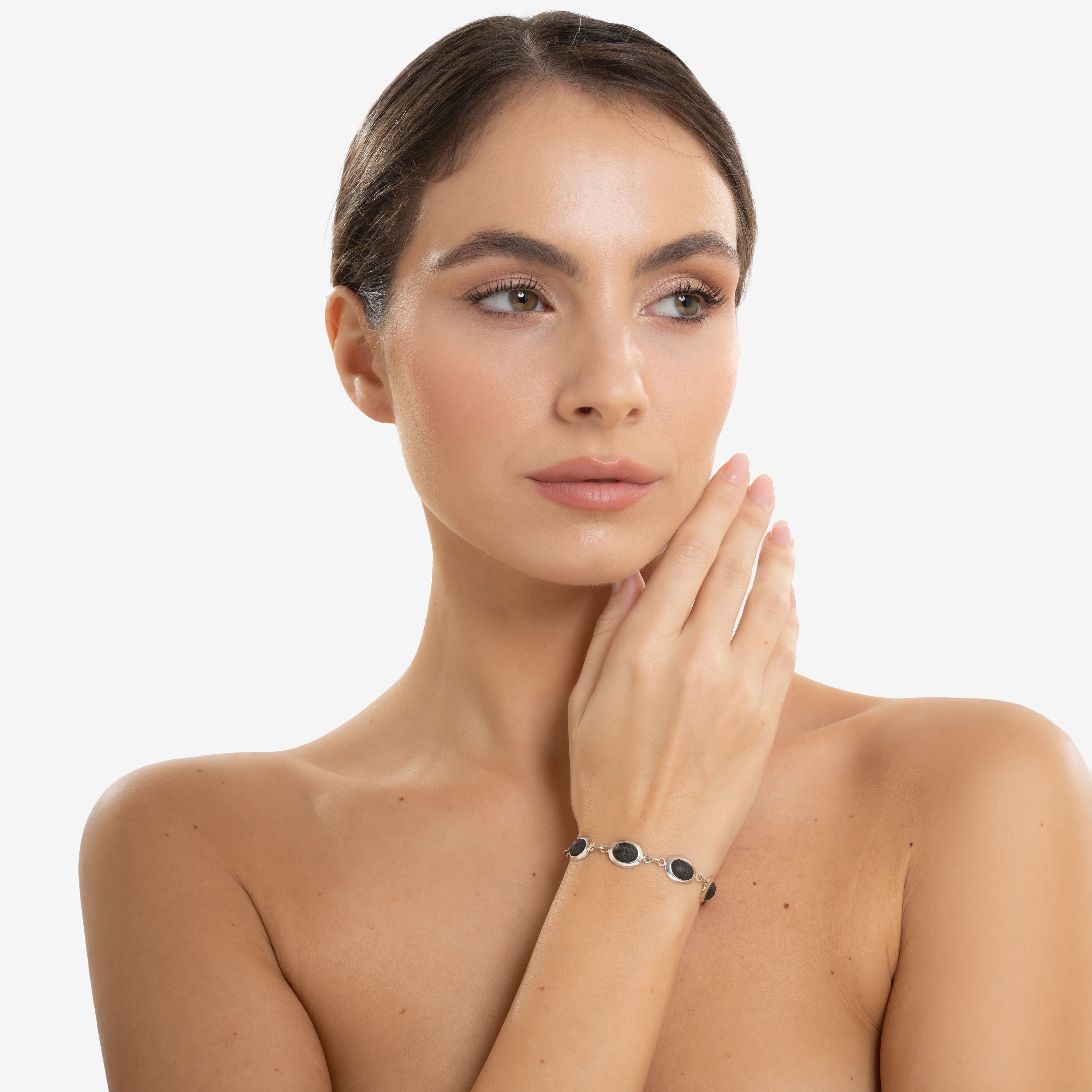 Bracciale composto da elementi ovali di pietra lavica naturale, incastonati in montature in argento 925. Il contrasto tra la profondità scura della lava e la lucentezza metallica dell’argento crea un equilibrio di forza e luminosità. Ogni dettaglio riflette la cura artigianale e la precisione delle forme essenziali.