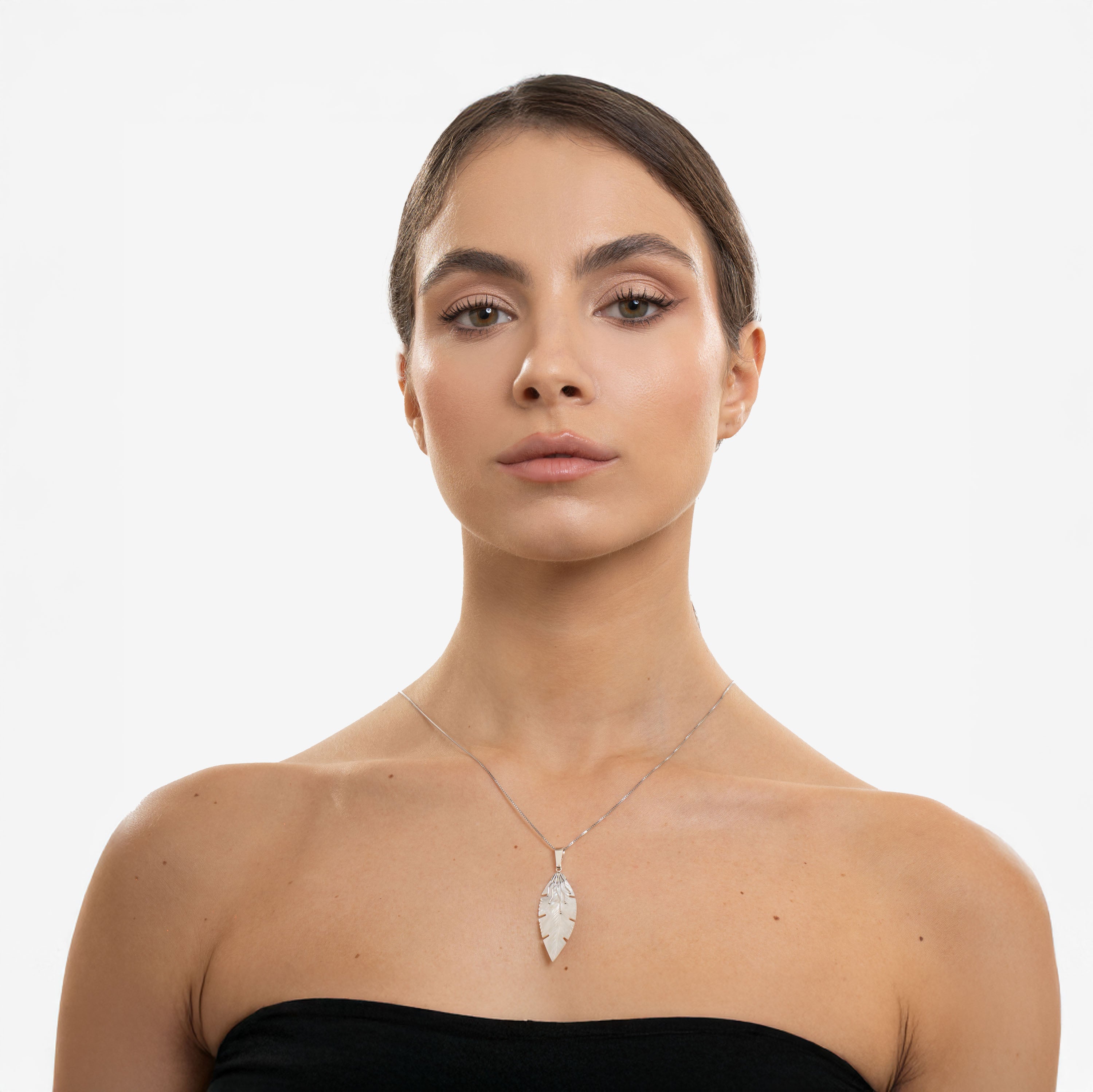 La silhouette, che richiama una foglia stilizzata o una fiamma geometrica, è scolpita in madreperla intagliata e rifinita in argento 925 con estrema cura.