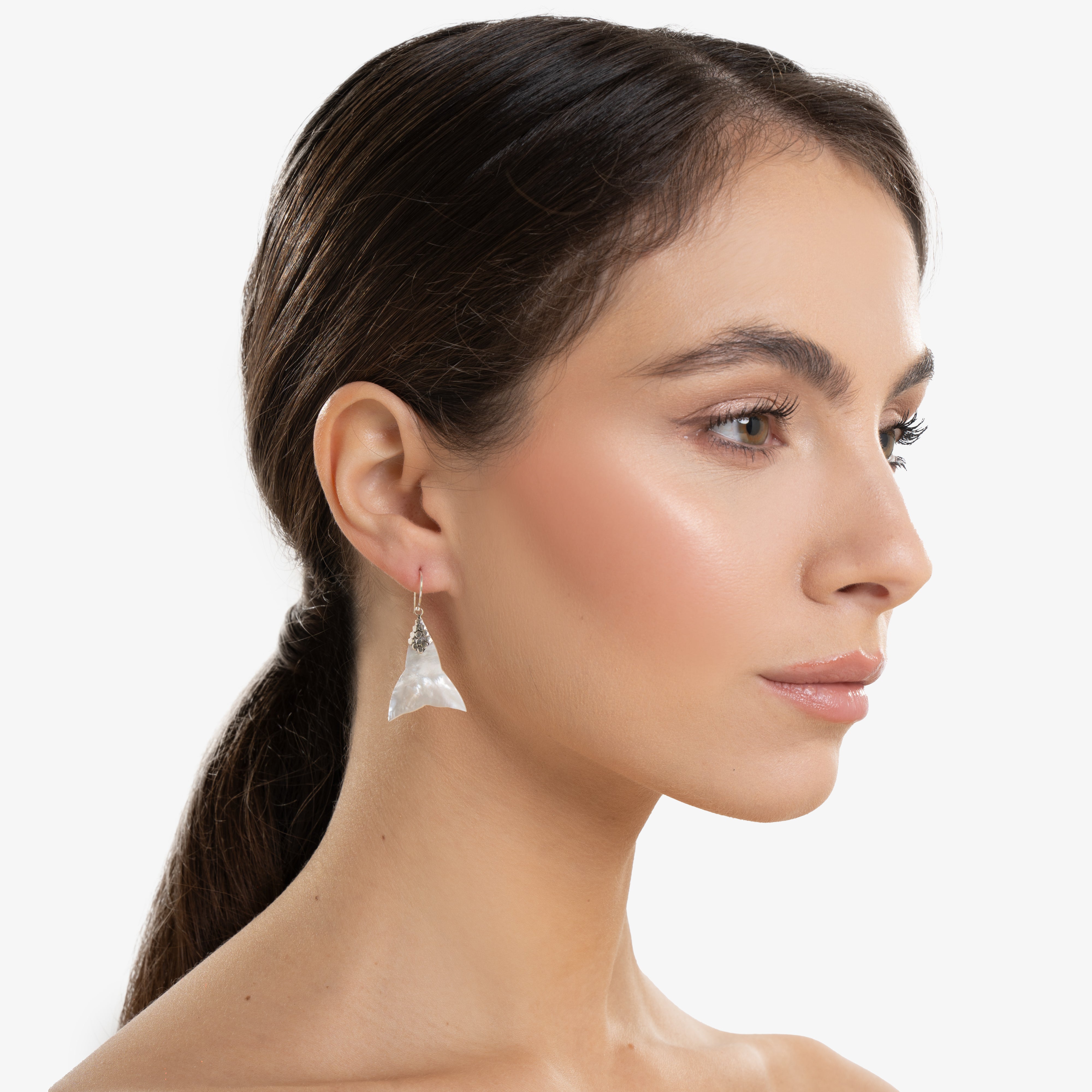 Questi orecchini pendenti presentano un elemento in madreperla naturale scolpito a mano in una forma stilizzata che richiama una coda di balena. L’effetto visivo è leggero e dinamico, amplificato dalla superficie cangiante della madreperla che riflette sfumature opalescenti a ogni movimento. La parte superiore è completata da una cupola in argento 925, dal disegno decorativo che dona un tocco artigianale e ricercato. Il gancio in argento garantisce comfort e fluidità nel movimento.