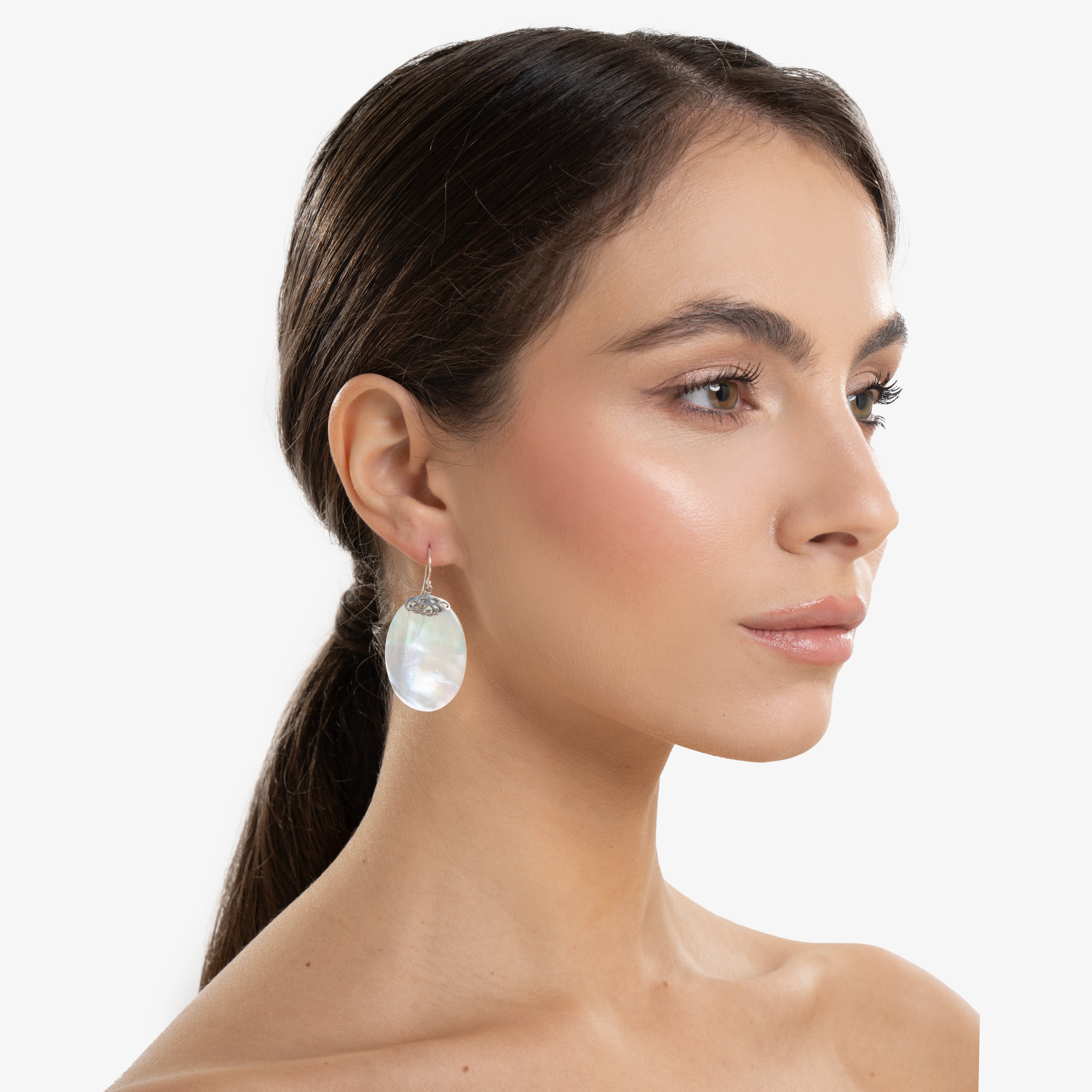 Questi orecchini pendenti sono composti da una grande ellisse di madreperla naturale, levigata e lucidata per esaltarne i riflessi iridescenti e cangianti. L’elemento in madreperla è montato con una cupola traforata in argento 925 che avvolge la parte superiore della forma ovale, creando un contrasto delicato tra il disegno decorativo e la superficie liscia. Il gancio in argento dona leggerezza e movimento al gioiello, rendendolo ideale per chi cerca una presenza luminosa ma armoniosa.