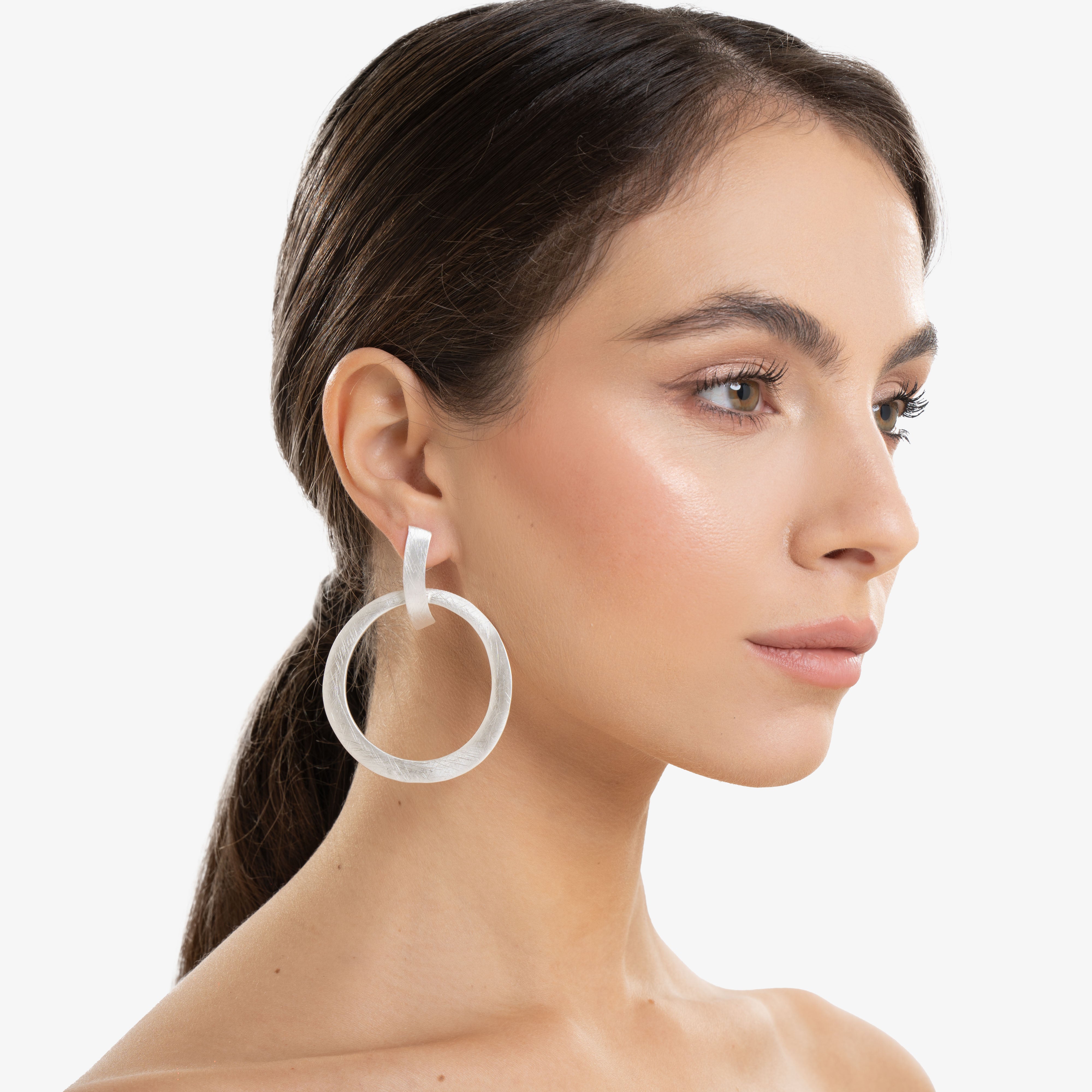 Realizzati in lega di zinco anallergica questi orecchini esaltano la texture materica del metallo, donando un effetto moderno e distintivo. La finitura argento satinato cattura la luce in modo delicato, valorizzando la loro eleganza discreta.