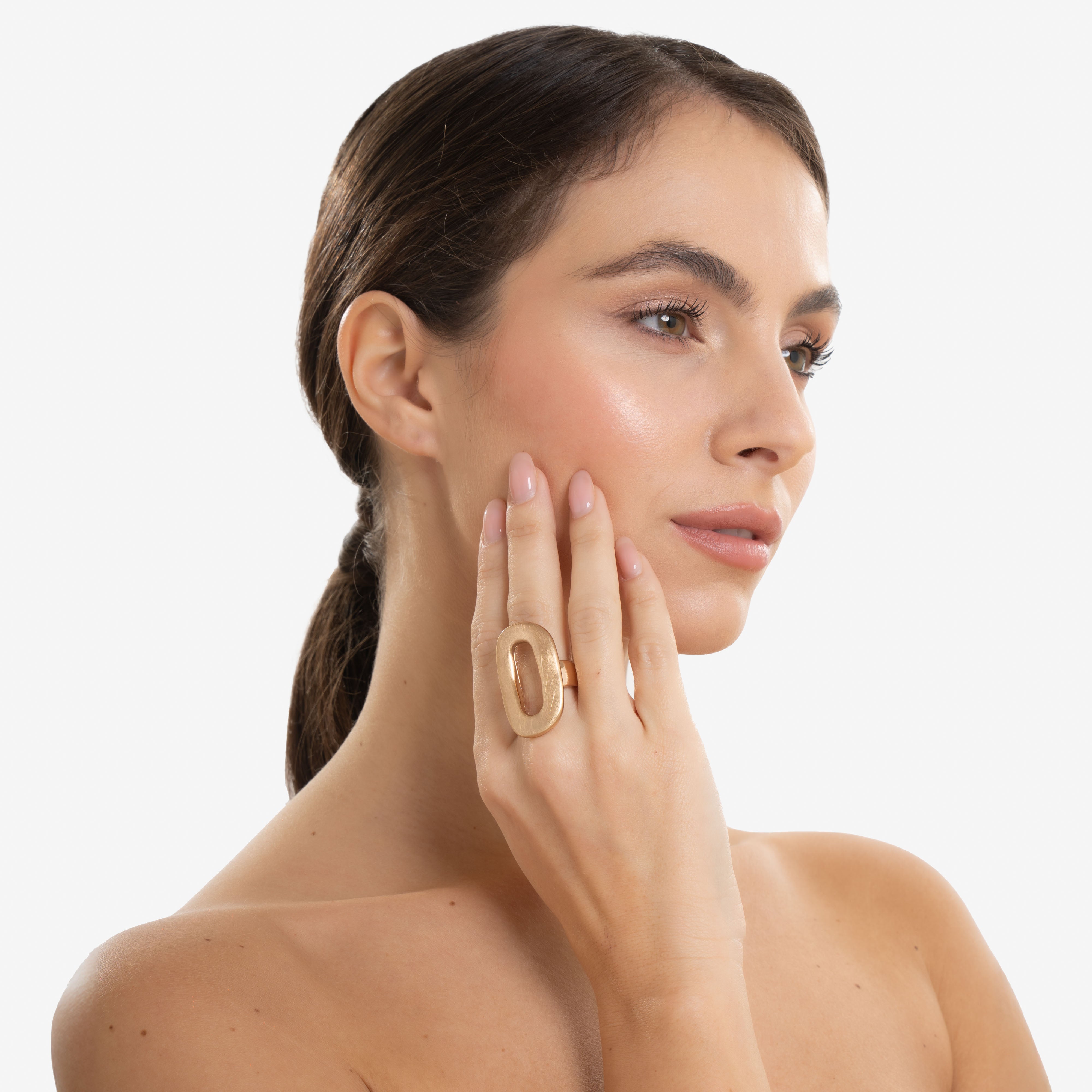 Un equilibrio perfetto tra materia e luce. Ouro è un anello dal design minimalista ma distintivo, caratterizzato da una superficie dorata con effetto graffiato, che crea un affascinante contrasto di texture. Il suo foro centrale aggiunge un dettaglio architettonico unico, giocando con i vuoti e conferendo un senso di leggerezza e profondità.