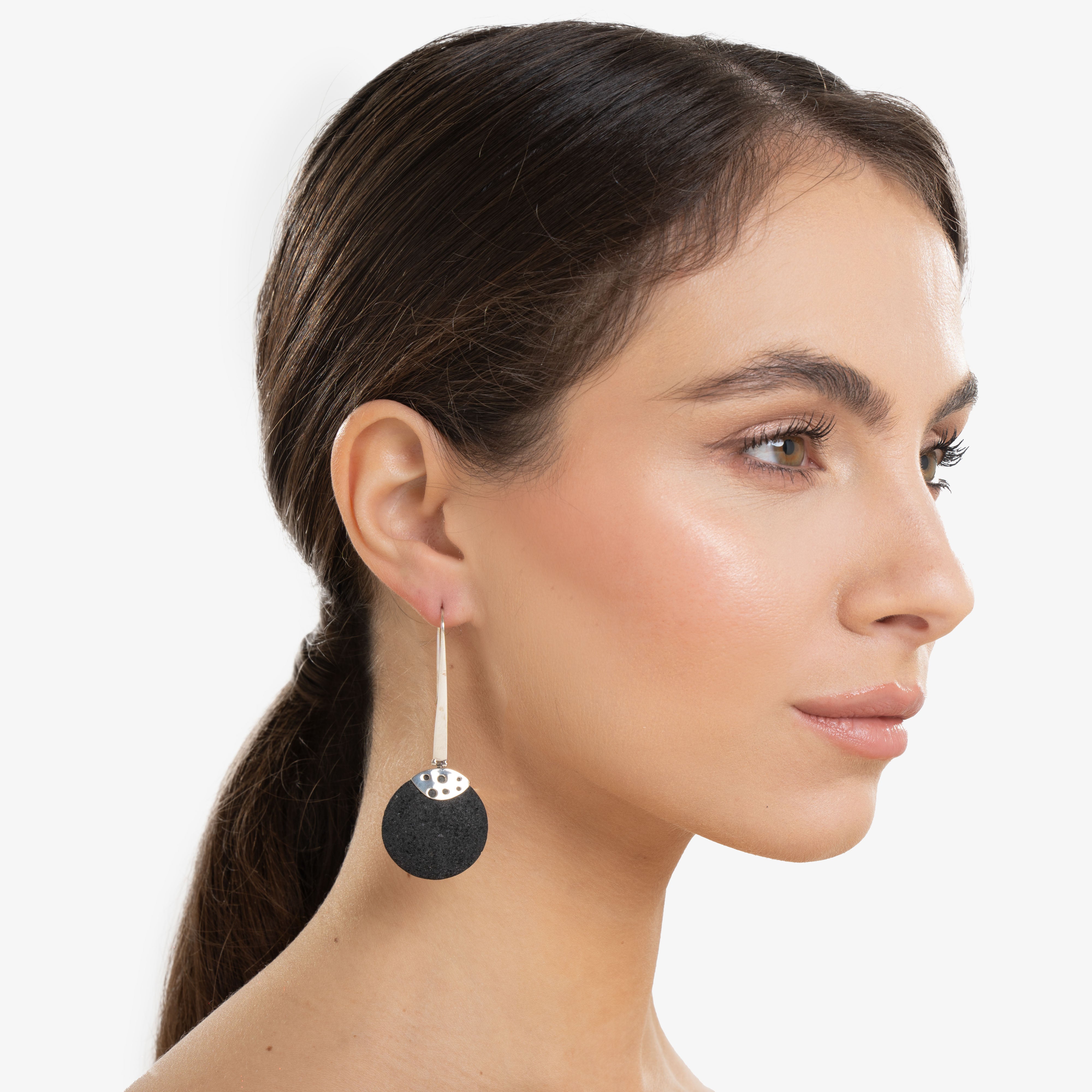 Gli orecchini Cuma incarnano un’eleganza essenziale e senza tempo, ispirandosi alla perfetta armonia tra elementi naturali e design raffinato. Il loro equilibrio visivo è dato dalla leggerezza della struttura in argento 925, che accompagna con fluidità un disco di pietra lavica.