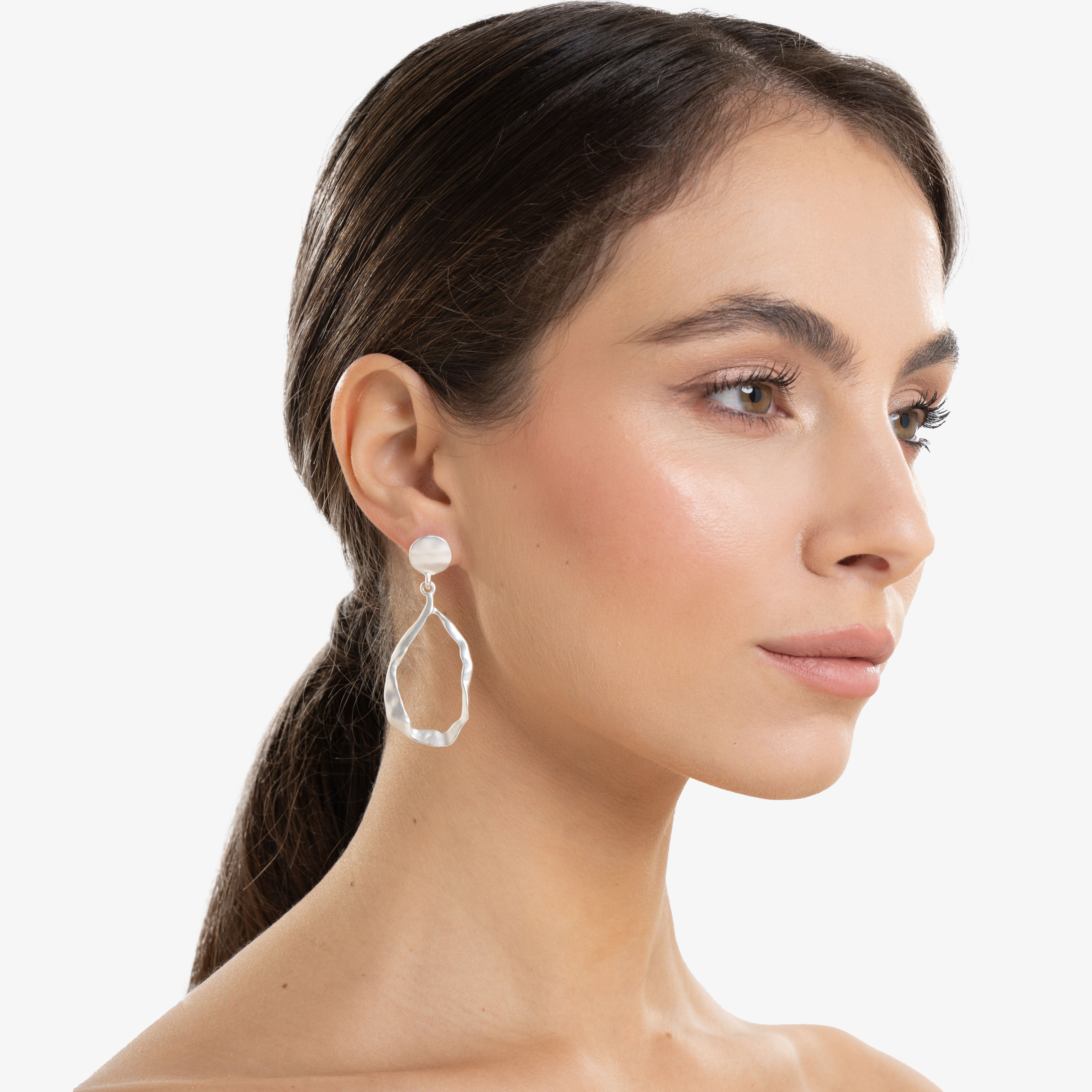 Realizzati in lega di zinco anallergica con finitura argento satinato, questi orecchini esaltano il gioco di luci e ombre grazie alla loro particolare lavorazione martellata. La chiusura a lobo assicura una vestibilità stabile e confortevole, rendendoli perfetti per essere indossati tutti i giorni o per occasioni più raffinate.