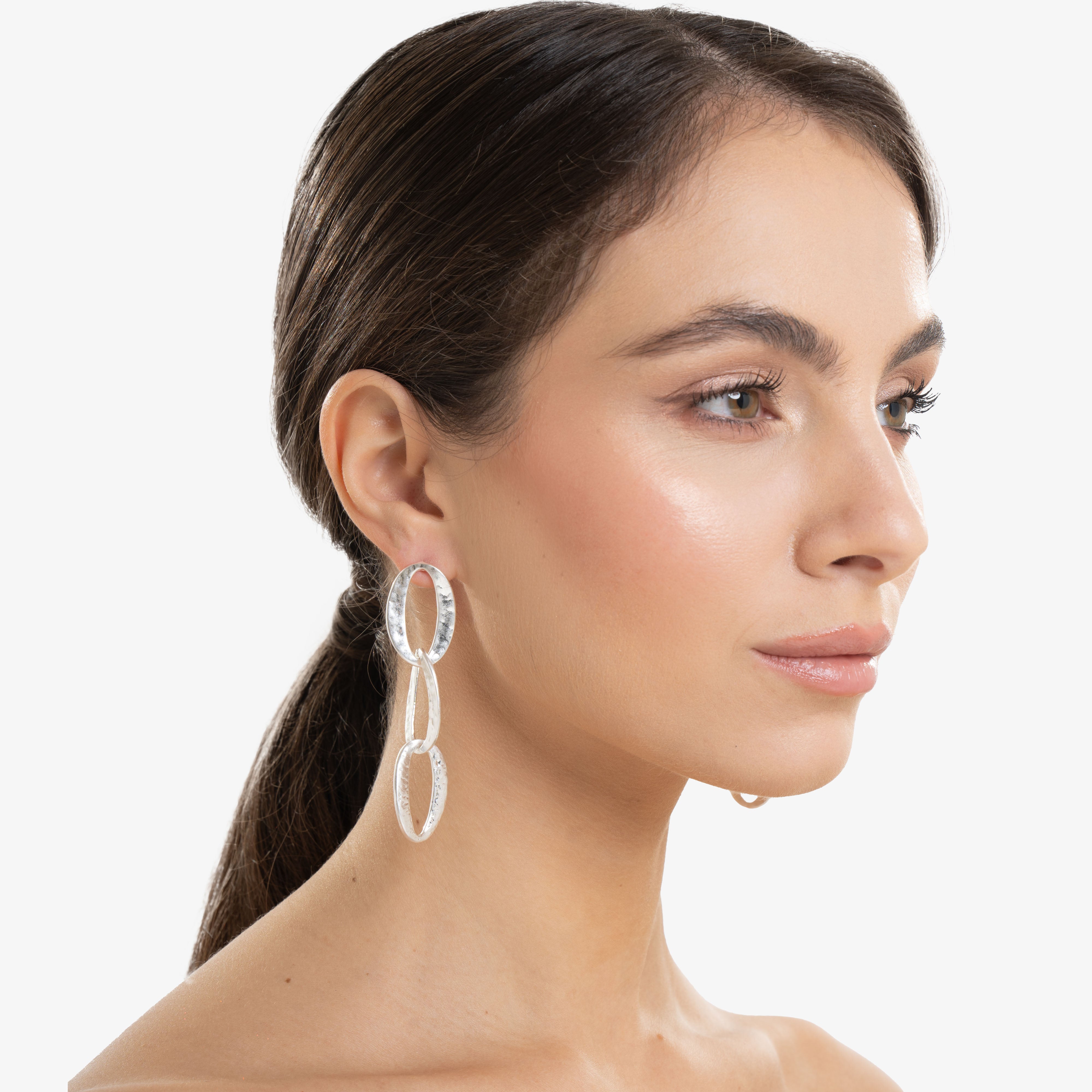 Realizzati in lega di zinco anallergica con una finitura argento satinato, questi orecchini riflettono la luce con discrezione, donando un tocco di sofisticata raffinatezza. La chiusura a lobo assicura una vestibilità comoda e stabile, rendendoli perfetti per essere indossati ogni giorno o per occasioni più eleganti.