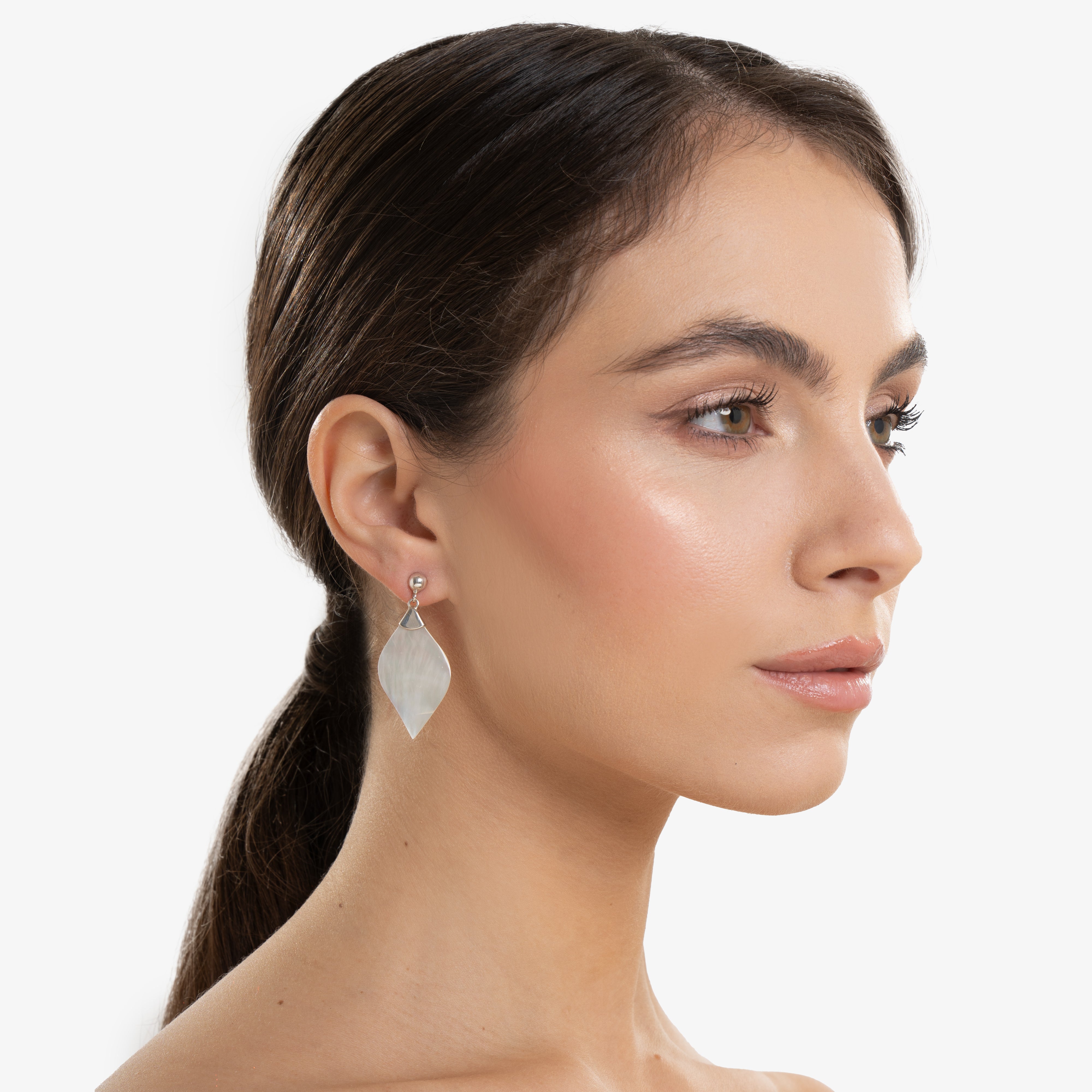 Realizzati artigianalmente, questi orecchini pendenti uniscono la lucentezza dell’argento 925 alla delicatezza cangiante della madreperla naturale, sagomata in una forma a goccia stilizzata, leggera e sinuosa. Il perno a sfera in argento dona stabilità e pulizia alla linea, mentre la leggera curvatura del pendente crea giochi di luce che variano a ogni movimento.