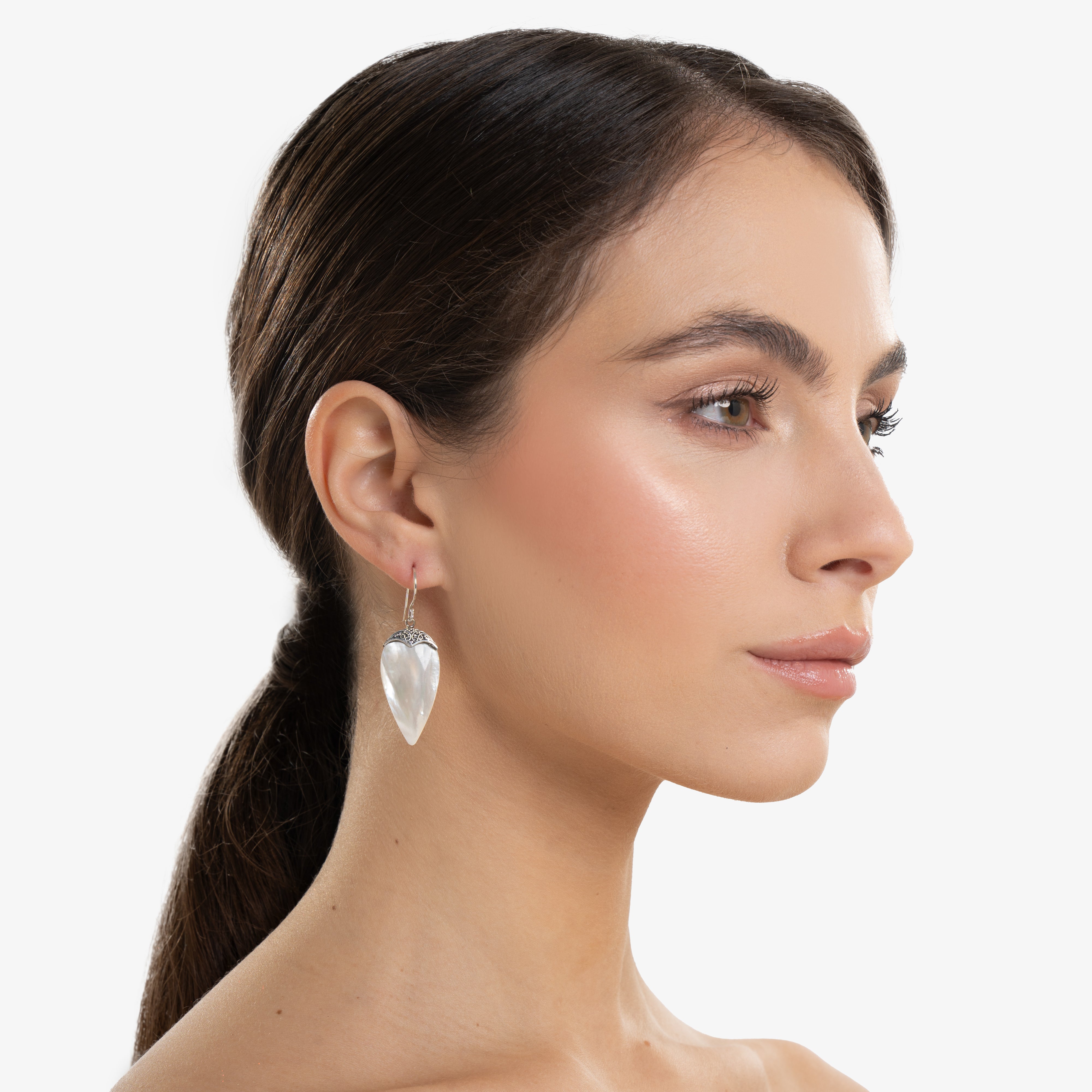 Questi orecchini pendenti presentano un elemento centrale in madreperla naturale intagliato a mano in una forma a goccia piena e affusolata. Il punto di congiunzione con il gancio in argento 925 è rifinito con una delicata fascia lavorata a texture, che dona al pezzo un dettaglio ornamentale sottile ma deciso. Il gancio leggero consente un movimento fluido, mentre la madreperla cattura e riflette la luce con sfumature morbide e iridescenti.